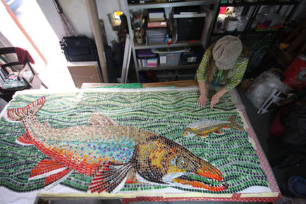 My most recent large commission was a large outdoor mosaic piece for the Mayo Local Authority Waters Programme to raise awareness of the Blue Dot sites in Mayo, and in particular, the pristene waters of wonderful Lough Mask, in Tourmakeady, which still has a population of Arctic Char.